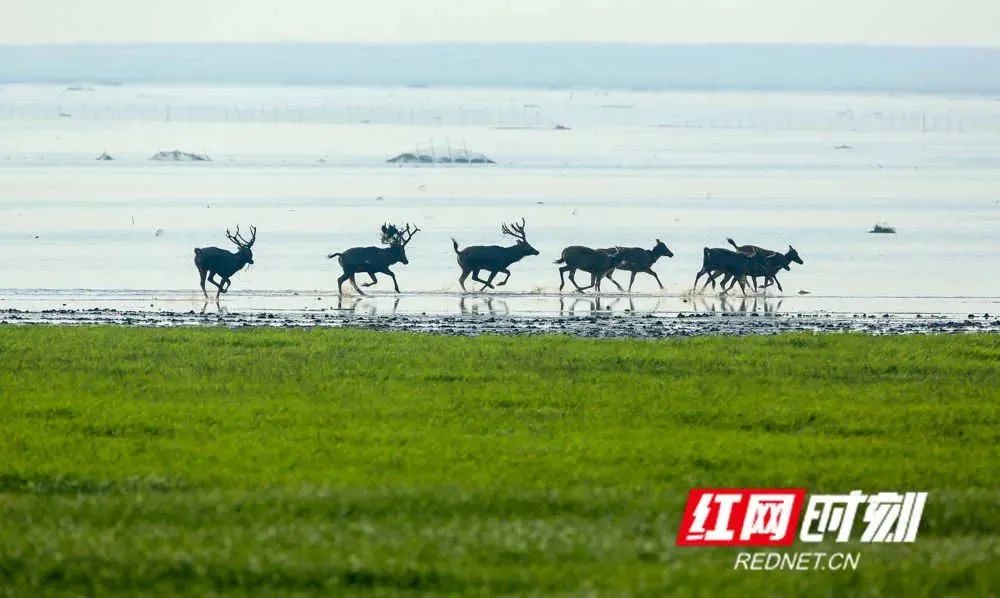 ▲洞庭湖边奔跑的野生麋鹿。杨一九/摄